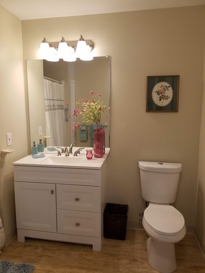 - Well-lit vanity offers plenty storage